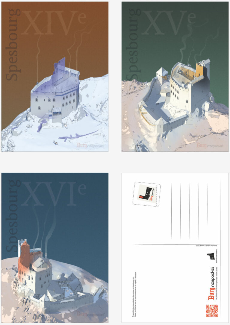 3 propositions de restitution du château au XIVème, XVème et XVIème siècle.